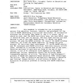 This handbook is intended for use in preparing persons from education, business, industry, and government for therole of DACUM (Developing a Curriculum) facilitator. An introduction discusses the following: what DACUM is, why it is unique, why it should be used, what the DACUM facilitator does, who uses DACUM, whenit should be used, and its quality. The next eight sections are each devoted to one of the eight DACUM duties:(1) market the DACUM process;(2) plan the DACUM workshop;(3) recruit the DACUM workshop committee