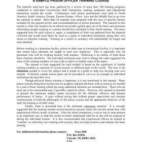The material used here has been gathered by a review of more than 100 training programs conducted in individual Correctional Staff institutions, training academies and educational institutions around the world. Conferences with prison practitioners were held in North America, South America, Europe, Eastern Europe, Africa, Asia and the Middle East to go over the material in detail. More than 30 manuals were prepared with the laws of specific nations included for …